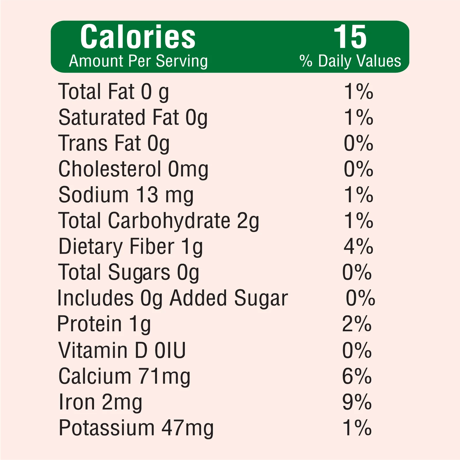 NUTRITION FACTS 25 Servings per container Serving Size, tbsp (4 grams) Calories, 15 Amount per Serving, % Daily Values Total Fat 0 g, 1% Saturated Fat 0g, 1% Trans Fat 0g, 0% Cholesterol 0mg, 0% Sodium 13 mg, 1% Total Carbohydrate 2 g, 1% Dietary Fiber 1g, 4% Total Sugars 0g, 0% Includes 0g Added Sugar, 0% Protein 1 g, 2% Vitamin D 0IU, 0% Calcium 71mg, 6% Iron 2mg, 9% Potassium 47mg, 1%