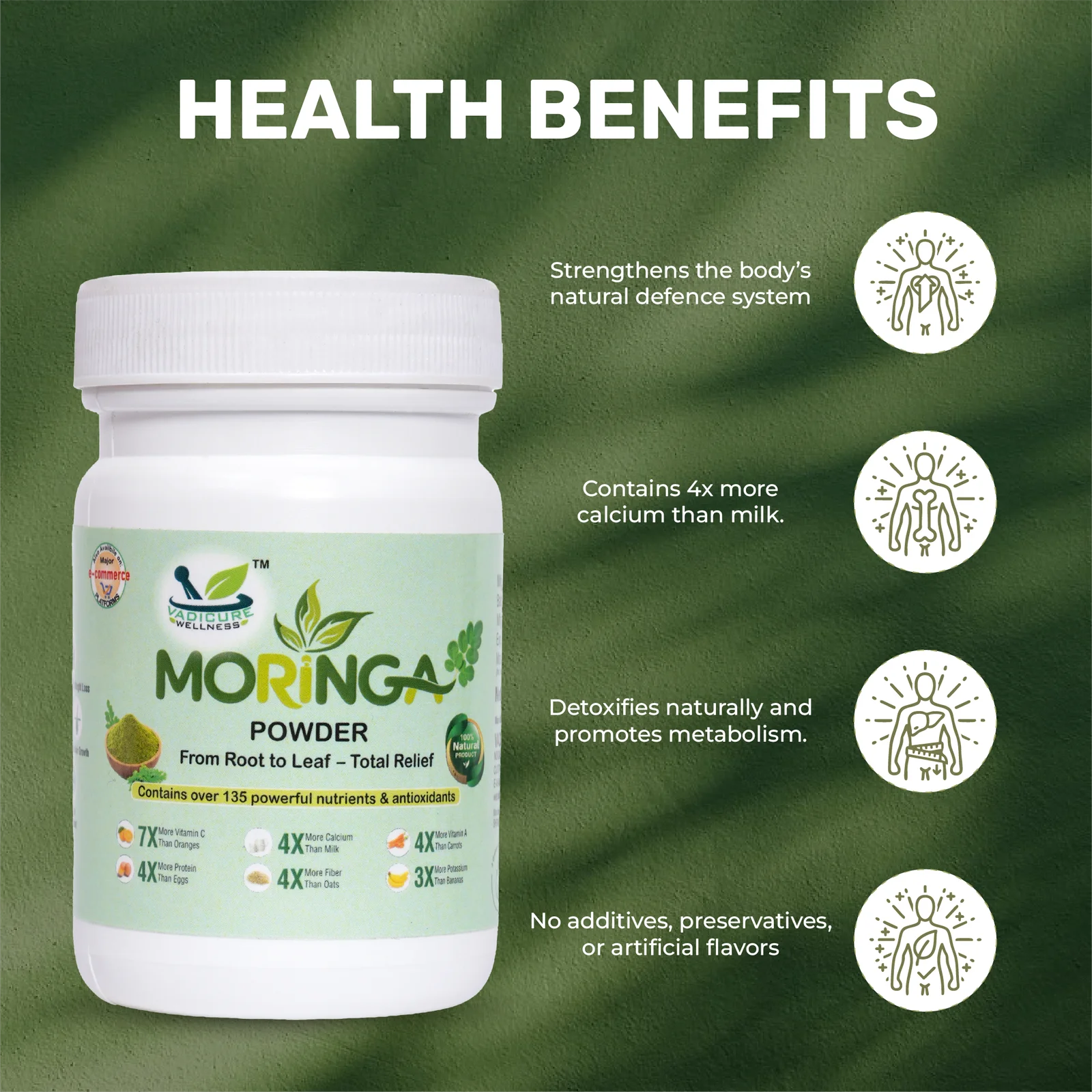 Vadicure Wellness Moringa Powder is a pure and natural health supplement derived from Moringa leaves and roots, offering a rich source of vitamins, minerals, and antioxidants. Known to contain 7x more Vitamin C than oranges, 4x more calcium than milk, and 3x more potassium than bananas, it helps strengthen bones, improve digestion, boost immunity, and enhance overall vitality. Perfect for daily use, this herbal supplement supports total body wellness from root to leaf.