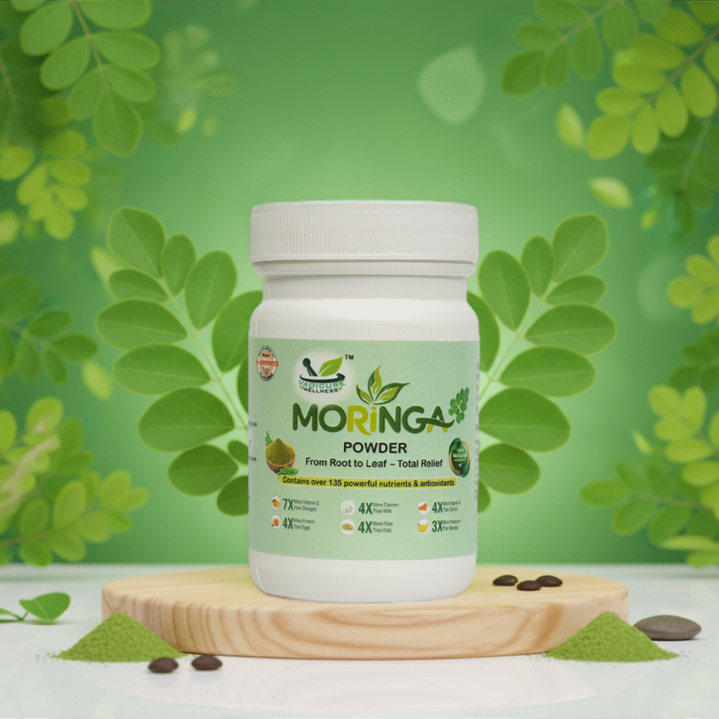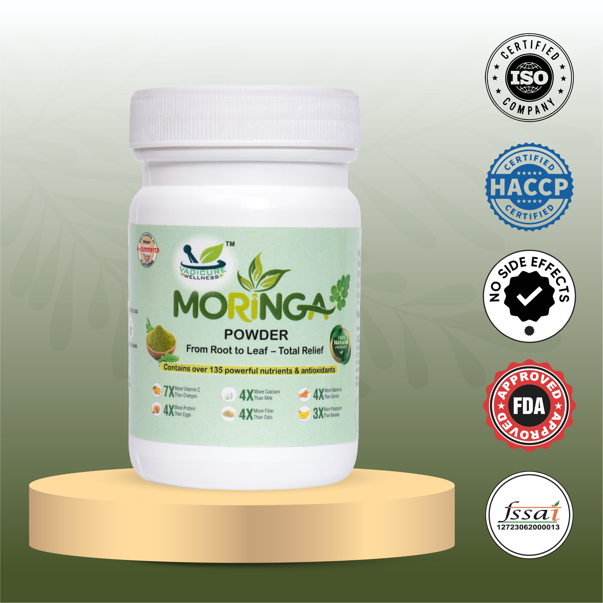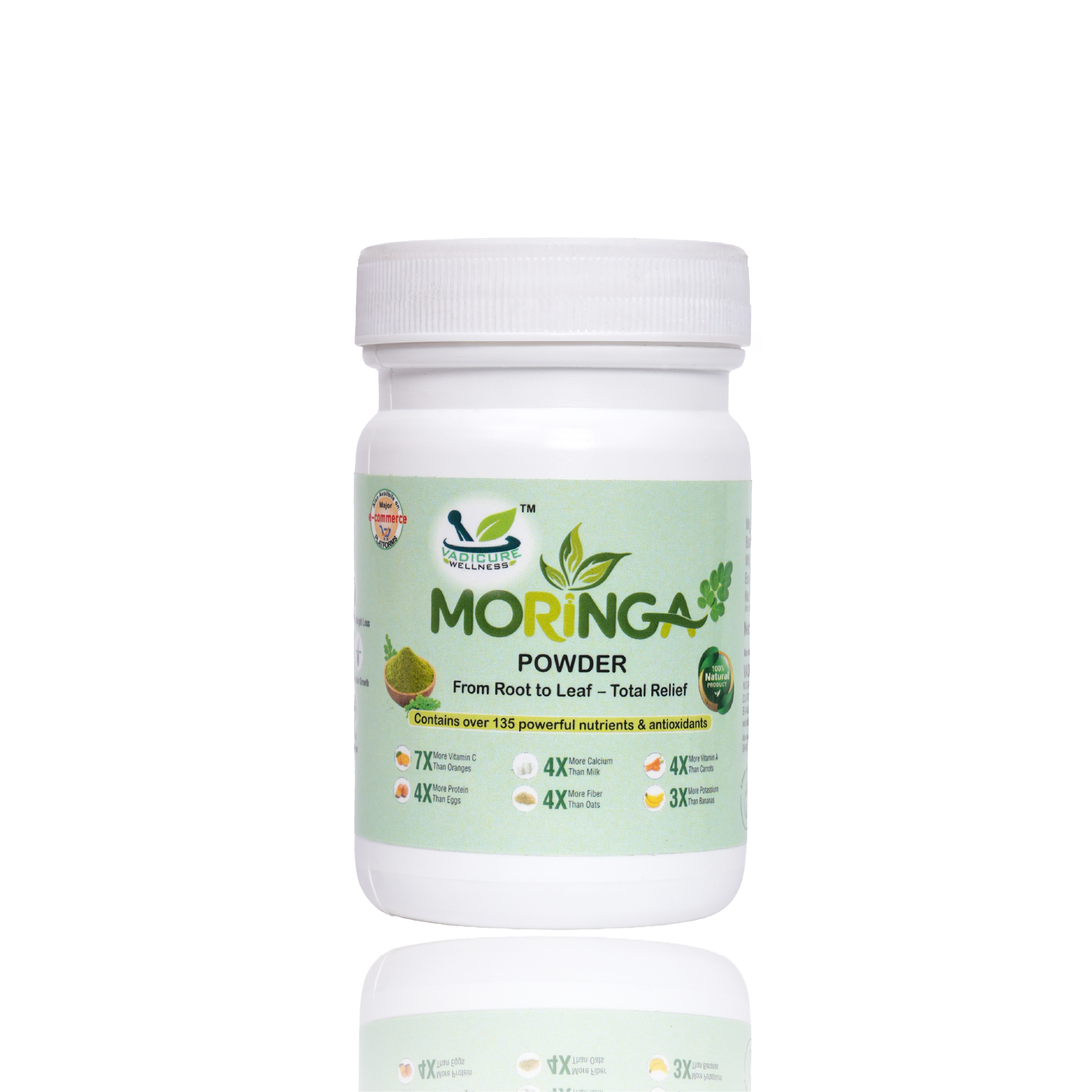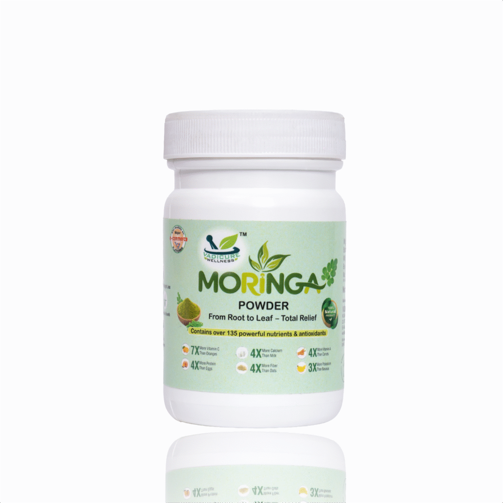 Vadicure Wellness Moringa Powder is a pure and natural health supplement derived from Moringa leaves and roots, offering a rich source of vitamins, minerals, and antioxidants. Known to contain 7x more Vitamin C than oranges, 4x more calcium than milk, and 3x more potassium than bananas, it helps strengthen bones, improve digestion, boost immunity, and enhance overall vitality. Perfect for daily use, this herbal supplement supports total body wellness from root to leaf.