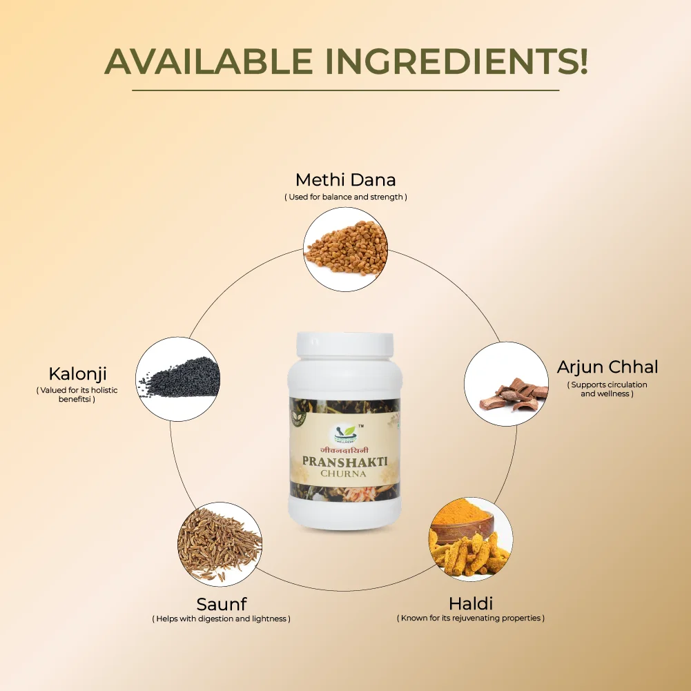 Pranshakti Jeewandayani Churn is a natural Ayurvedic blend crafted with carefully chosen herbs to support overall vitality and wellness. This time-honored formula brings together traditional ingredients like methi, haldi, arjun chhal, saunf, dalchini, kalonji and more—each known in Ayurveda for its unique qualities that help maintain balance, strength, and energy in daily life.
