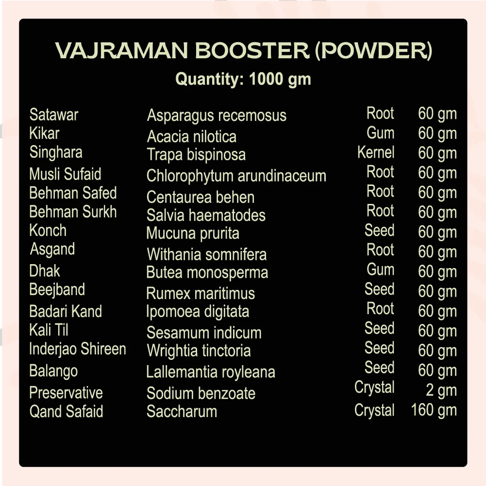 Every pack of Vajramen Men Booster Powder is prepared with carefully chosen herbs, maintaining traditional authenticity while ensuring modern standards of quality. It reflects the harmony of Ayurvedic knowledge and mindful preparation.
