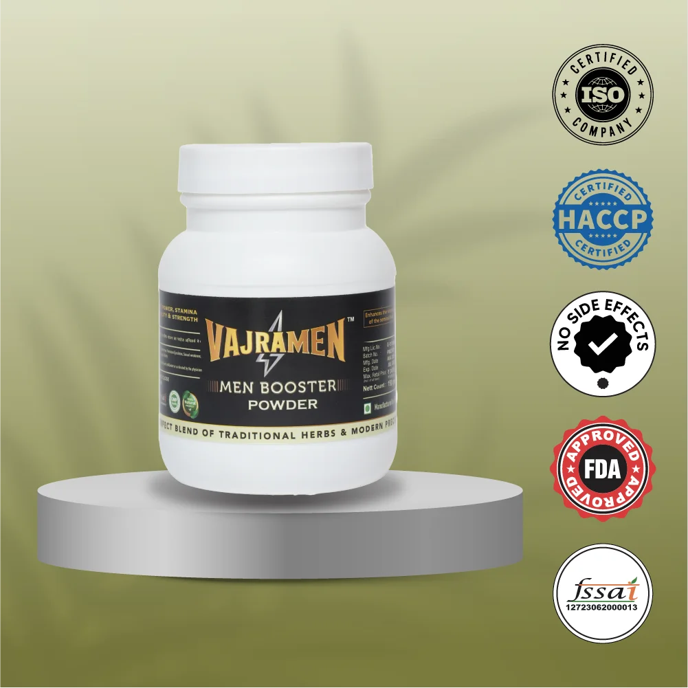 Vadicure Wellness Vajramen Men Booster Powder is a powerful Ayurvedic powder for male strength and energy, carefully formulated with potent herbs known to enhance stamina, vitality, and performance. This natural stamina booster powder supports improved endurance, muscle strength, and overall sexual wellness without any harmful side effects. Regular use helps combat fatigue, boost confidence, and promote better energy levels throughout the day. Choose Vajramen — the best Ayurvedic powder for strength and stamina — and experience the ancient science of Ayurveda redefined for modern men.