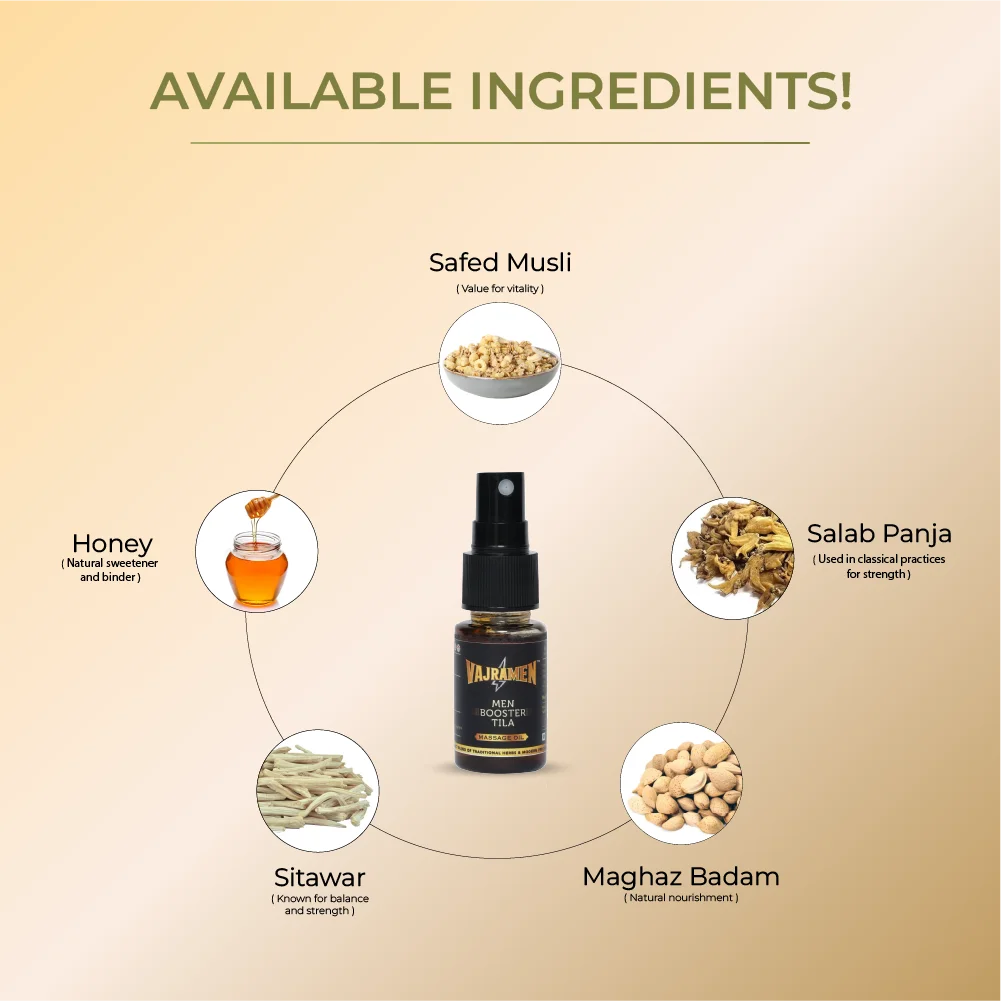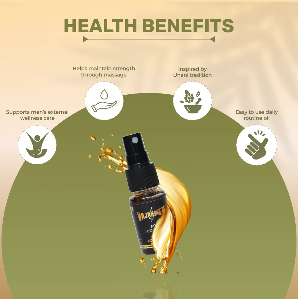 Vajramen Men Booster Tila is a premium Unani herbal massage oil designed for external use. Made with a unique combination of aromatic oils and traditional herbs, it reflects centuries of wellness heritage in a modern form.