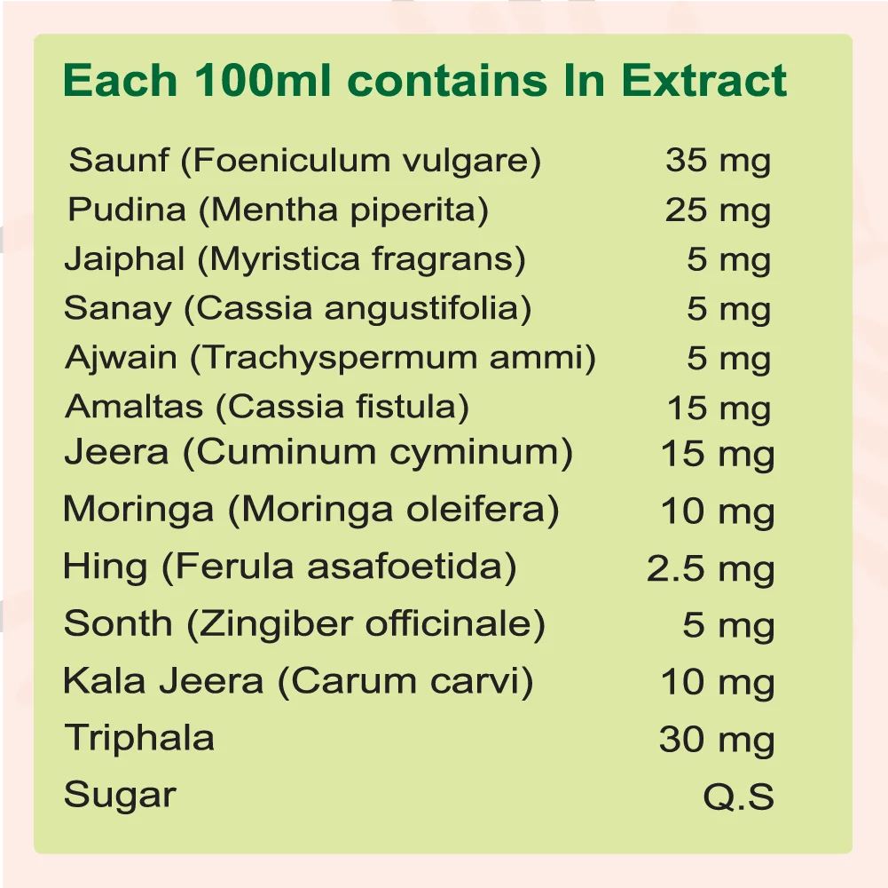 INGREDIENTS : Saunf (Fennel Seeds) – cooling and soothing for digestion Jeera (Cumin Seeds) – supports metabolism and eases indigestion Pudina (Mint) – refreshing herb for stomach comfort Moringa – known for its natural nutrients and digestive support Jaiphal & Hing – traditional spices for balancing digestion Sanay & Amaltas – support natural bowel movement regulation Sonth & Ajwain – warm herbs that ease gas and bloating Kala Jeera – adds digestive balance Triphala – classical Ayurvedic blend for digestive health