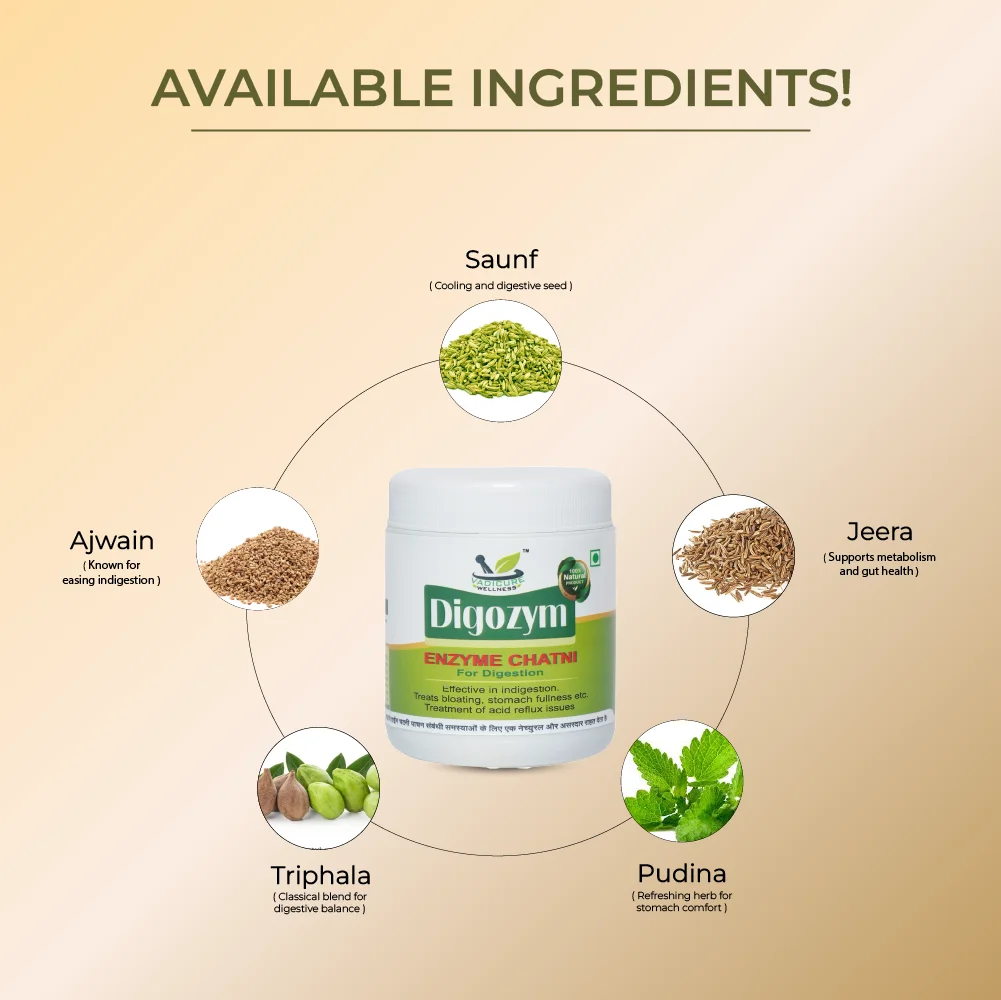 Digozym Enzyme Chatni is a unique herbal digestive chutney prepared with a blend of seeds, spices, and classical herbs. Enriched with Saunf, Jeera, Pudina, Triphala, Ajwain, Hing, Moringa, and more, it is designed to support digestion naturally while adding a refreshing taste after meals.