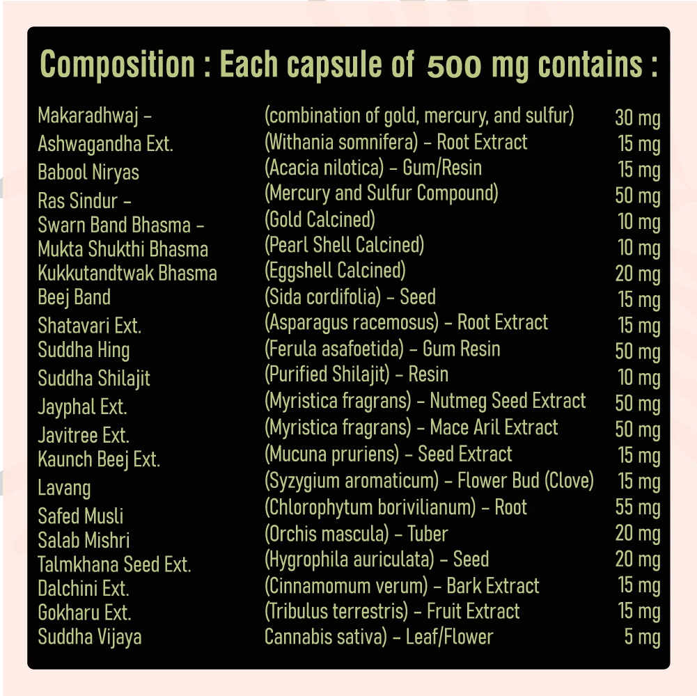 INGREDIENTS : Ashwagandha (Withania somnifera) – A traditional adaptogenic root believed to help with strength, balance, and reducing fatigue. Shilajit (Purified Resin) – Revered in Ayurveda as a rejuvenator, often used for vitality and endurance. Safed Musli (Chlorophytum borivilianum) – A root known for its nourishing properties and role in supporting stamina. Shatavari (Asparagus racemosus) – A root valued for overall nourishment and balance. Kaunch Beej (Mucuna pruriens) – A seed traditionally associated with strength and vitality. Gokharu (Tribulus terrestris) – A fruit extract used in Ayurveda for promoting balance and natural wellness. Makaradhwaj, Ras Sindur, Swarn Band Bhasma, Mukta Shukthi Bhasma, Kukkutandtwak Bhasma – Classical mineral-based preparations traditionally incorporated in formulations to enhance their efficacy. Dalchini, Jayphal, Javitri, Lavang – Spice extracts that not only provide natural warmth but also complement the formulation.